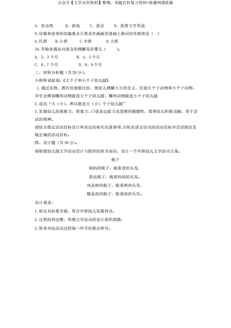 学前儿童语言教育与活动指导试题猴哥6个月前发布关注私信98.35KB2页08917学前儿童语言教育与活动指导试题此内容为免费资源,请登录后查看¥0 登录查看免费资源 第1页 / 共2页 第2页 / 共2页 已完成全部阅读,共2页 © 版权声明文章版权归作者所有,未经允许请勿转载。THE END期末复习 喜欢就支持一下吧点赞17赞赏 分享QQ空间微博QQ好友海报分享复制链接收藏