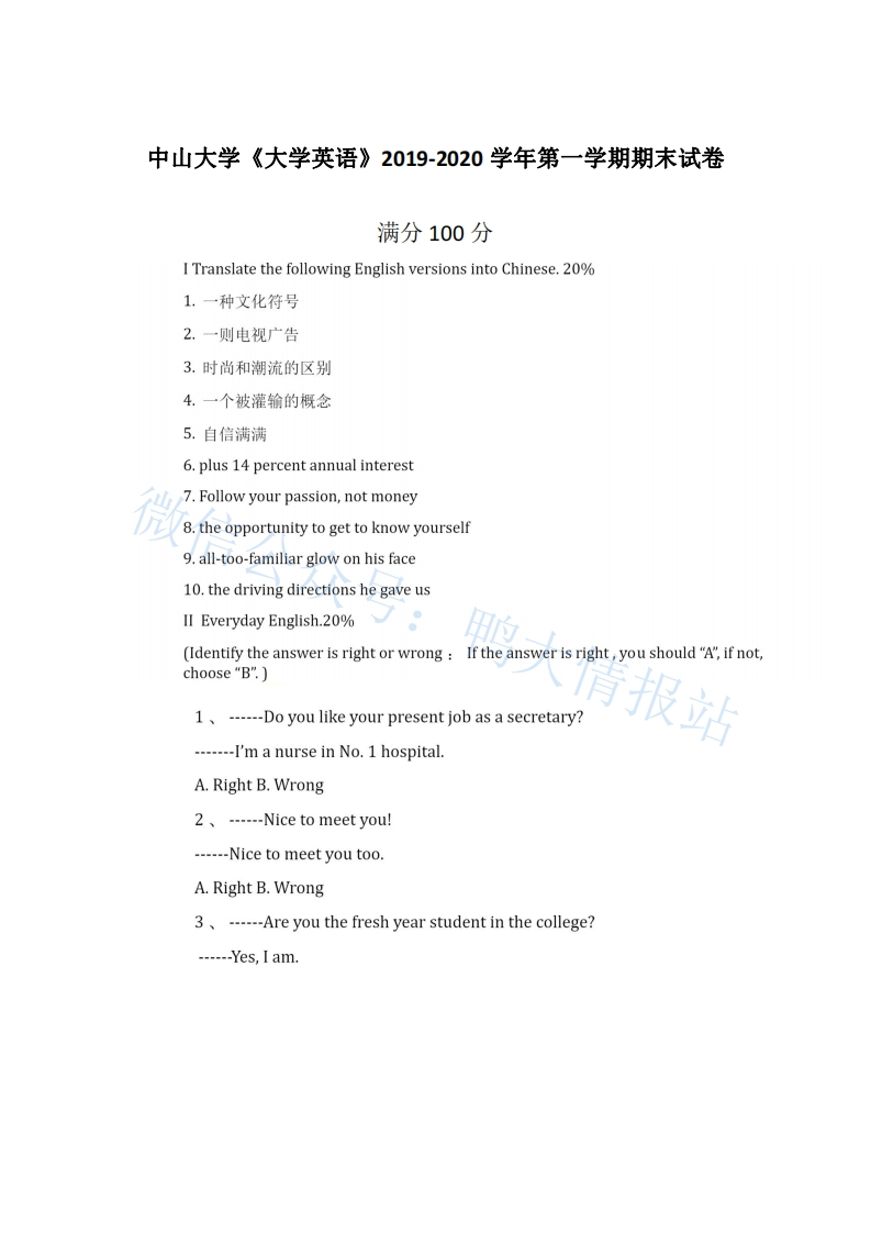中山大学《大学英语》2019-2020学年期末试卷猴哥16天前发布关注私信1.64MB8页03512中山大学《大学英语》2019-2020学年期末试卷此内容为免费资源,请登录后查看¥0 登录查看免费资源 第1页 / 共8页 第2页 / 共8页 第3页 / 共8页 该文档为免费文档,您可直接下载完整版进行阅读 © 版权声明文章版权归作者所有,未经允许请勿转载。THE END教材课件 喜欢就支持一下吧点赞12赞赏 分享QQ空间微博QQ好友海报分享复制链接收藏
