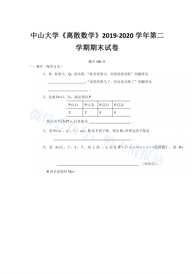 中山大学《离散数学》2019-2020期末试卷(1)猴哥16天前发布关注私信2.86MB9页0319中山大学《离散数学》2019-2020期末试卷(1)此内容为免费资源,请登录后查看¥0 登录查看免费资源 第1页 / 共9页 第2页 / 共9页 第3页 / 共9页 该文档为免费文档,您可直接下载完整版进行阅读 © 版权声明文章版权归作者所有,未经允许请勿转载。THE END教材课件 喜欢就支持一下吧点赞9赞赏 分享QQ空间微博QQ好友海报分享复制链接收藏
