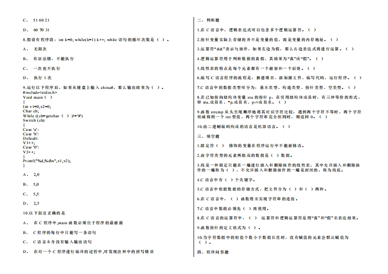 南通大学《C语言程序设计》2022-2023年第一学期期末试卷猴哥13天前发布关注私信0.14MB3页02314南通大学《C语言程序设计》2022-2023年第一学期期末试卷此内容为免费资源,请登录后查看¥0 登录查看免费资源 第1页 / 共3页 第2页 / 共3页 第3页 / 共3页 已完成全部阅读,共3页 © 版权声明文章版权归作者所有,未经允许请勿转载。THE END《南通大学》期中期末历年真题期末试卷 喜欢就支持一下吧点赞14赞赏 分享QQ空间微博QQ好友海报分享复制链接收藏