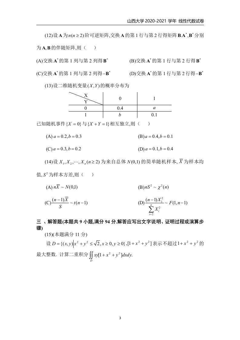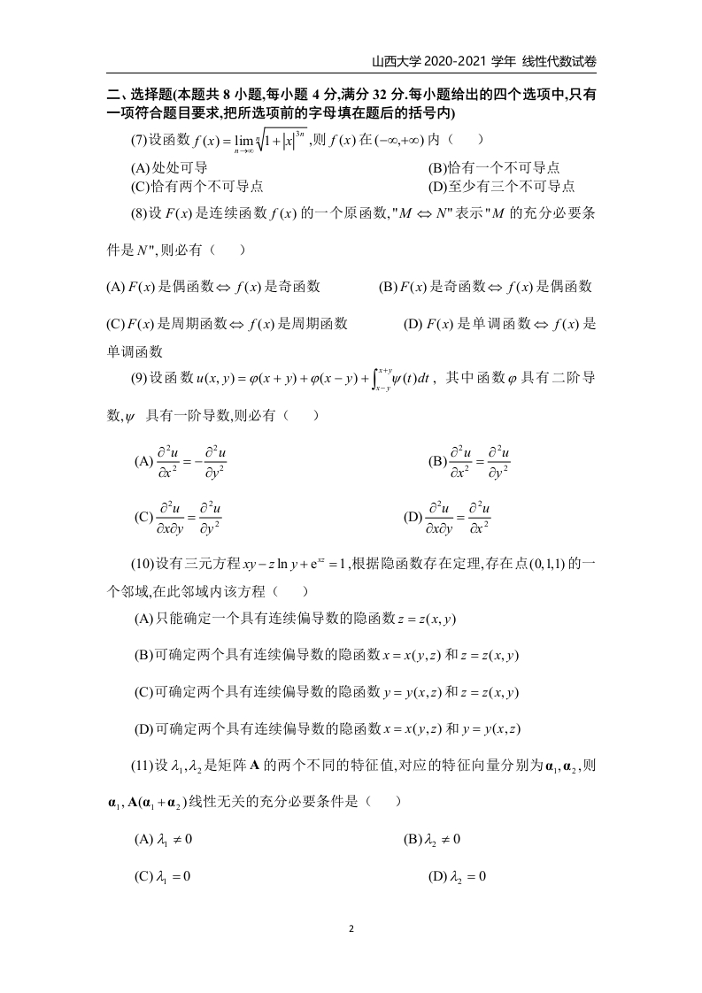 山西大学《线性代数》2020-2021学年第一学期期末试卷猴哥12天前发布关注私信0.20MB6页04714山西大学《线性代数》2020-2021学年第一学期期末试卷此内容为免费资源,请登录后查看¥0 登录查看免费资源 第1页 / 共6页 第2页 / 共6页 第3页 / 共6页 该文档为免费文档,您可直接下载完整版进行阅读 © 版权声明文章版权归作者所有,未经允许请勿转载。THE END《山西大学》期中期末历年真题期末试卷 喜欢就支持一下吧点赞14赞赏 分享QQ空间微博QQ好友海报分享复制链接收藏